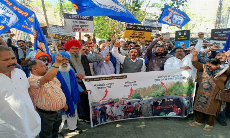 ਆਪ ਸਰਕਾਰ ਦੇ ਰਾਜ ਵਿਚ ਦਲਿਤਾਂ ਦਾ ਦਮਨ ਕੀਤੇ ਜਾਣ ਦੇ ਵਿਰੋਧ ਵਿੱਚ ਬਹੁਜਨ ਸਮਾਜ ਪਾਰਟੀ (ਬਸਪਾ) ਵੱਲੋਂ ਐੱਸਐੱਸਪੀ ਜਲੰਧਰ ਦਿਹਾਤੀ ਦਫਤਰ ਅੱਗੇ ਪ੍ਰਦਰਸ਼ਨ ਕੀਤਾ ਗਿਆ। ਬਸਪਾ ਦੇ ਇਸ ਪ੍ਰਦਰਸ਼ਨ ਵਿੱਚ ਵੱਡੀ ਗਿਣਤੀ ’ਚ ਲੋਕ ਪਹੁੰਚੇ, ਜਿਨ੍ਹਾਂ ਨੇ ਆਪ ਸਰਕਾਰ ਤੇ ਪੁਲਿਸ ਪ੍ਰਸ਼ਾਸਨ ਖਿਲਾਫ ਨਾਅਰੇਬਾਜ਼ੀ ਕੀਤੀ। ਇਸ ਪ੍ਰਦਰਸ਼ਨ ਨੂੰ ਸੰਬੋਧਿਤ ਕਰਦੇ ਹੋਏ ਬਸਪਾ ਦੇ ਸੂਬਾ ਕੋਆਰਡੀਨੇਟਰ ਤੀਰਥ ਰਾਜਪੁਰਾ ਤੇ ਸੂਬਾ ਜਨਰਲ ਸਕੱਤਰ ਐਡਵੋਕੇਟ ਬਲਵਿੰਦਰ ਕੁਮਾਰ ਨੇ ਕਿਹਾ ਕਿ ‘ਆਪ’ ਸਰਕਾਰ ਦੇ ਚਾਰ ਸਾਲਾਂ ਦੇ ਰਾਜ ਵਿੱਚ ਜਿੱਥੇ ਹੋਰ ਵਰਗਾਂ ਖਿਲਾਫ ਧੱਕੇਸ਼ਾਹੀ ਕੀਤੀ ਗਈ ਹੈ, ਉਥੇ ਜਲੰਧਰ ਵਿੱਚ ਦਲਿਤਾਂ ਨੂੰ ਦਬਾਉਣ ਲਈ ਕੰਮ ਕੀਤਾ ਜਾ ਰਿਹਾ ਹੈ।
