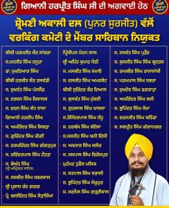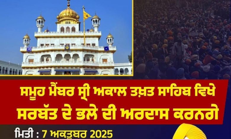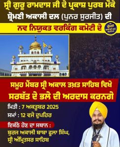 ਸ਼੍ਰੋਮਣੀ ਅਕਾਲੀ ਦਲ (ਪੁਨਰ ਸੁਰਜੀਤ) ਦੀ ਨਵ ਨਿਯੁਕਤ ਵਰਕਿੰਗ ਕਮੇਟੀ ਦੇ ਸਮੂਹ ਮੈਂਬਰ ਸਾਹਿਬਾਨ ਪਾਰਟੀ ਪ੍ਰਧਾਨ ਗਿਆਨੀ ਹਰਪ੍ਰੀਤ ਸਿੰਘ ਜੀ ਅਗਵਾਈ ਹੇਠ 7 ਅਕਤੂਬਰ 2025, ਮੰਗਲਵਾਰ ਨੂੰ ਸ੍ਰੀ ਅਕਾਲ ਤਖ਼ਤ ਸਾਹਿਬ, ਸ੍ਰੀ ਅੰਮ੍ਰਿਤਸਰ ਸਾਹਿਬ ਵਿਖੇ ਨਤਮਸਤਕ ਹੋਣਗੇ । ਸ਼੍ਰੋਮਣੀ ਅਕਾਲੀ ਦਲ ਦੀ ਪੁਨਰ ਸੁਰਜੀਤੀ, ਕੌਮੀ ਏਕਤਾ ਅਤੇ ਸਰਬੱਤ ਦੇ ਭਲੇ ਲਈ ਅਰਦਾਸ ਕੀਤੀ ਜਾਵੇਗੀ ।