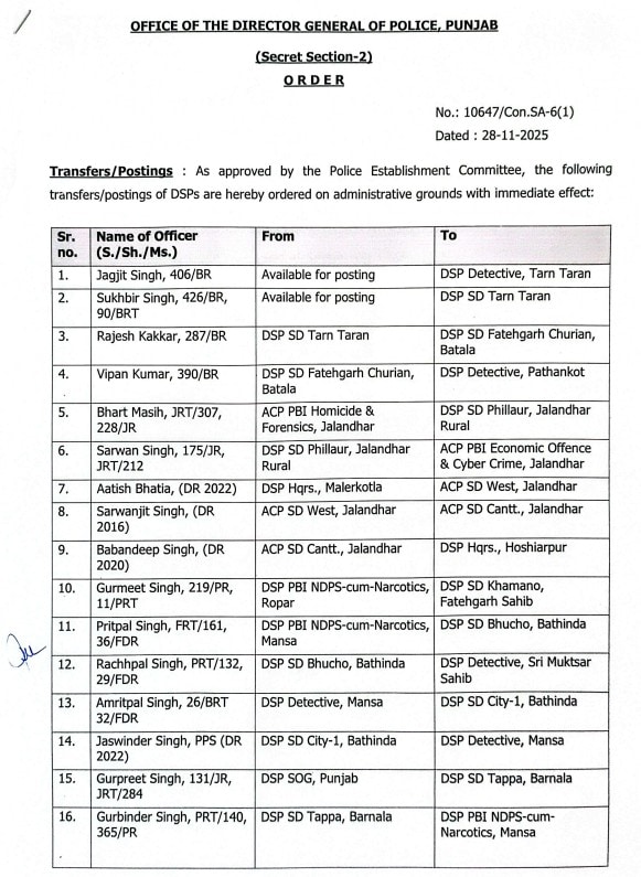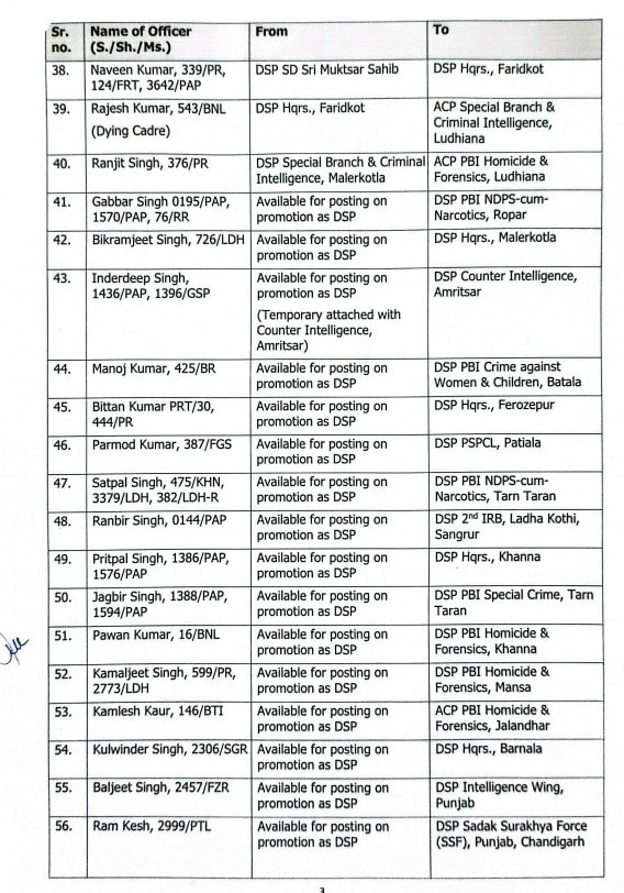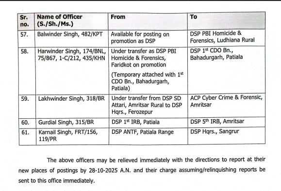 ਪੰਜਾਬ ਪੁਲਿਸ ਵਿਚ ਵੱਡੇ ਪੱਧਰ ਉਤੇ ਤਬਾਦਲੇ ਕੀਤੇ ਗਏ ਹਨ। 61 DSPs ਬਦਲੇ ਗਏ ਹਨ।